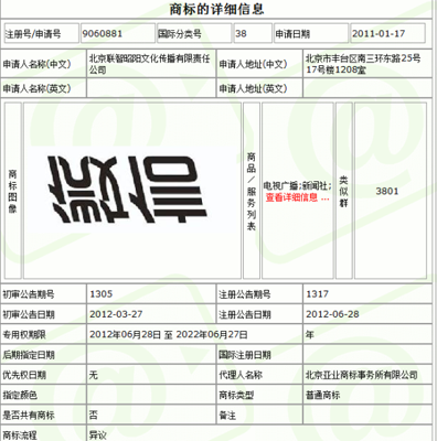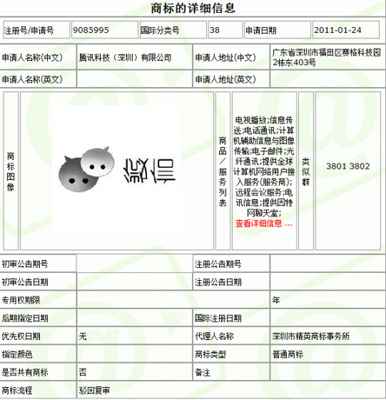 其中,最關(guān)鍵的第38類電信及通信服務(wù)被北京聯(lián)智昭陽文化傳播有限責任公司(以下簡稱“聯(lián)智”)搶注,申請日期為2011年1月17日,而騰訊公司對第38類商標的申請日期為2011年1月24日,較上述公司晚一個星期。